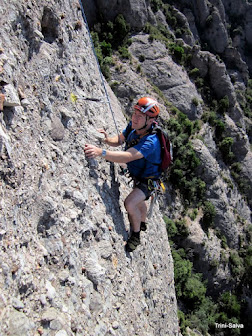 Un cop vam equipar-nos ens vam dividir en 3 cordades, primer comença a pujar el Manel, que es el meu company de cordada, desprès el Salva de primer d’una altre cordada (amb la Rosa i la Trini), per la mateixa via, la 45 anys desprès, que a mi em va fer molta il·lusió fer-la amb un dels seus equipadors.
